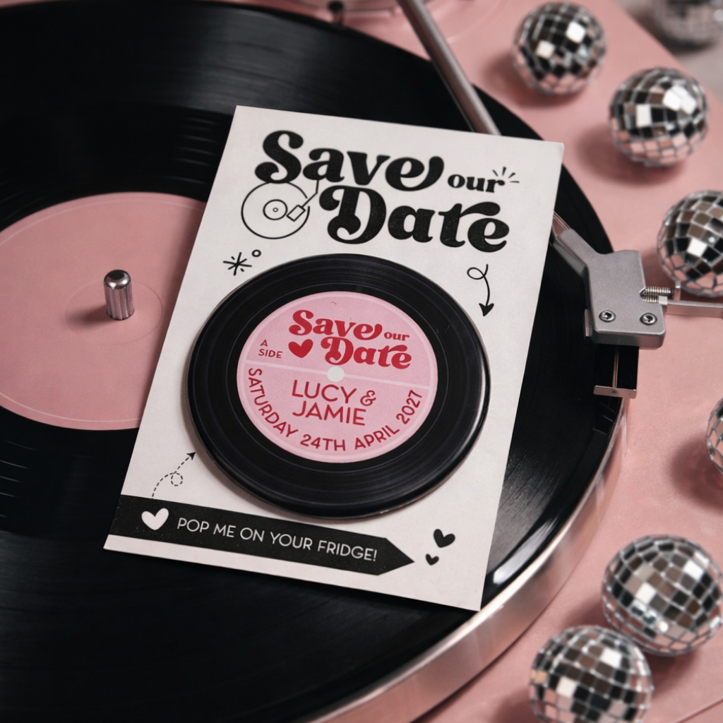 Vinyl record Inspired Save The Date Magnets & Mini Backing Cards.
