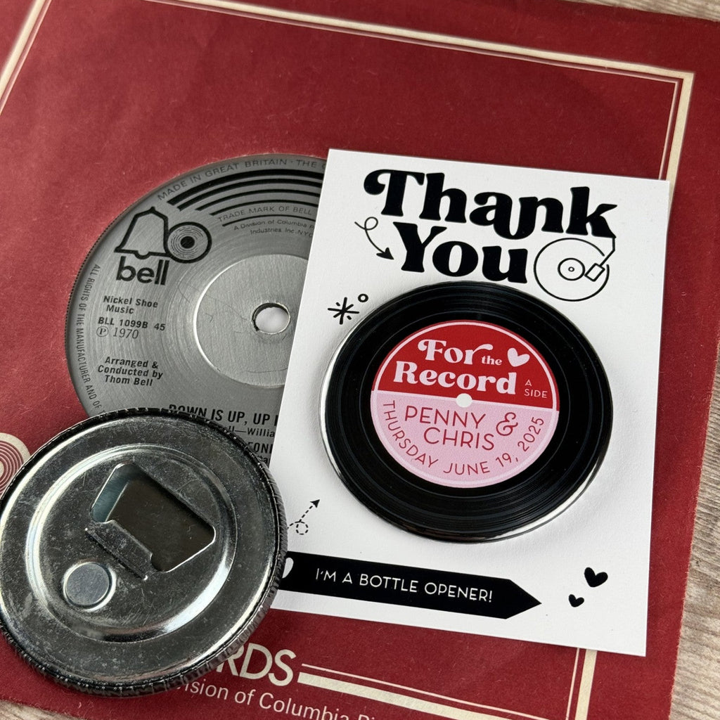Vinyl Record Inspired Wedding Favour Bottle Opener Fridge Magnets & Mini Backing Cards.